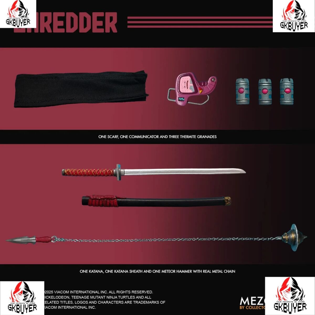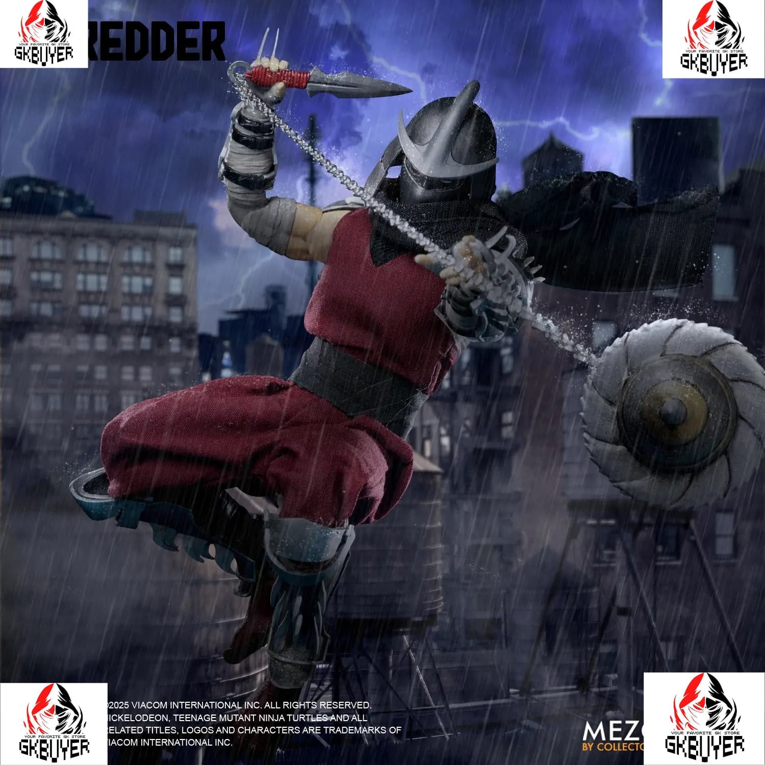 Outfitted in layered soft-goods armor with removable bladed components, Shredder is prepared for total domination. From his meteor hammer with a real metal chain to his thermite grenades and katana, every weapon reflects the Foot Clan’s ruthless efficiency. A variety of interchangeable hands allows him to grip, command, strike, and intimidate in any stance.